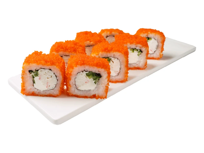 Рис, масаго оранжевая, мясо краба, сыр сливочный, огурец, майонез японский, нори.