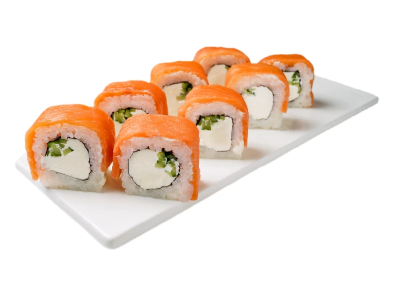Рис, лосось охл., сыр сливочный, огурец, нори.